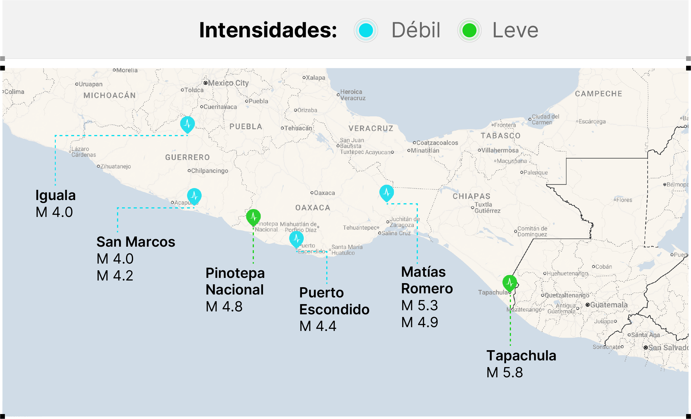 El sismo más relevante, dentro del territorio nacional, ocurrió el día 28 con epicentro cercano a Tapachula, Chiapas, de magnitud de 5.8. Este sismo generó intensidades leves en la región del epicentro al tener foco a más de 137 km de profundidad. Ningún sismo superó el umbral de alertamiento