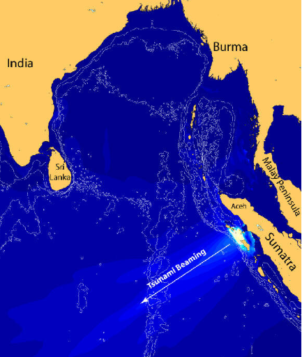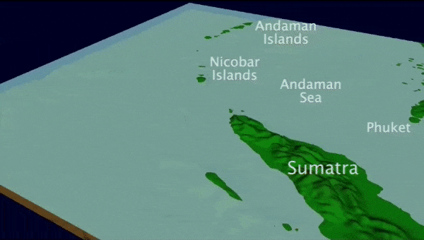 Imagen: Animación realizada por el USGS que muestra la evolución de las olas del tsunami causadas por el terremoto del 26 de diciembre de 2004 en Sumatra-Andaman. De acuerdo con el Servicio Geológico, debido a que se necesitan aproximadamente ocho minutos para que se rompa toda la falla, las olas de tsunami generadas cerca del epicentro se propagaron parcialmente hacia la Bahía de Bengala. Cuando el terremoto acaba de comenzar, se produjeron más olas de tsunami cerca de las islas Andaman, luego cruzaron el mar hacia Tailandia. (USGS)